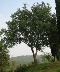 Albero alto 18-22 (20) m con tronco forte, dritto, suddiviso a breve altezza in molti robusti rami, allargato e talora con contrafforti alla base negli esemplari più vecchi;corteccia compatta, di colore grigiastro, con rugosità trasversali. Sistema radicale molto espanso e profondo, nel suo espandersi riesce a fratturare le rocce (da cui il nome di spaccasassi). Rami grossi, tortuosi, divergenti,chioma larga fino a 8-12 m. Foglie alterne, con piccioli di 0,5-1,5 cm e lamina da lanceolata a ovata. |